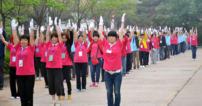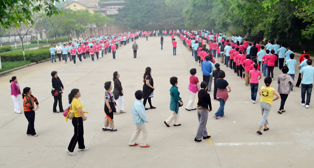 為了更好地達(dá)到健身功效,公司請(qǐng)專家精心編排了一套健身操??底税俚陆∩聿俨┎杀娂抑L(zhǎng),在借鑒佳木斯、山東廣場(chǎng)健身操的基礎(chǔ)上,巧妙的融入了部分民族的舞蹈語(yǔ)匯,整個(gè)健身操分七節(jié)共40個(gè)動(dòng)作。40個(gè)動(dòng)作或剛健有力,或輕柔詼諧,兼具動(dòng)感與美感,伴以節(jié)奏明快、耳熟能詳?shù)囊魳?lè),讓參與者不由自主的陶醉其中。